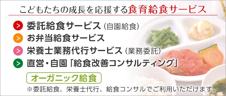 弊社は、保育園(保育所)、幼稚園、こども園、私立小学校・中学校の「食育給食」の「受託給食事業」、「栄養士代業務代行サービス」、「給食改善コンサルティングサービス」を行っております。