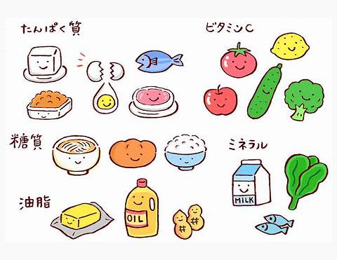 “6大栄養素”と“水”:炭水化物/たんぱく質/脂質/ビタミン/食物繊維/ミネラル/水