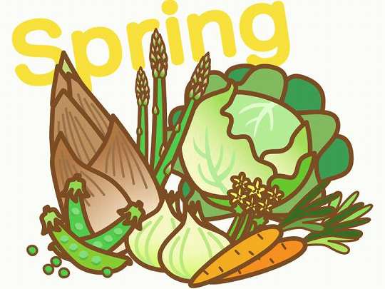 たけのこ、そらまめ、アスパラガス、キャベツ、新じゃがいも、新玉ねぎ、菜の花、春キャベツ、スナップエンドウ、たらの芽、ふきのとう、クレソン