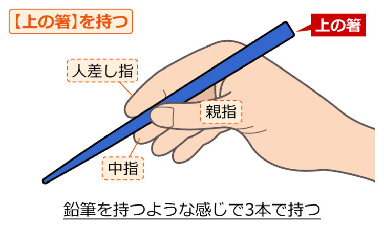 - 「上の箸」を鉛筆を持つような感じで持ちます。