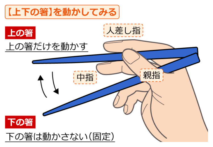 - 「人差し指」と「中指」の2本の指で、箸を上に動かしてみましょう。