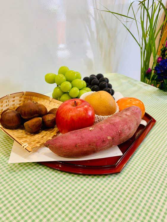 玄関には、栗、サツマイモ、リンゴ、ブドウなど、秋の食材が並べらえていて、「実りの秋」を感じました。