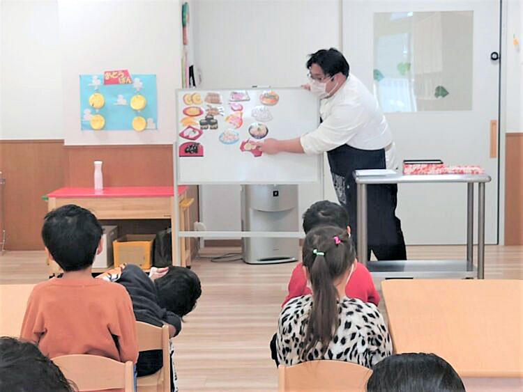 今日は東京都江東区のこども園で、月例の食育活動がありました。こちらの園では毎月ふきやの栄養士・調理師が各教室をまわって、こどもたちに食育活動を行っています。今日は調理師&食育アドバイザーの千葉さんが登場しました。
