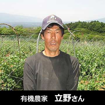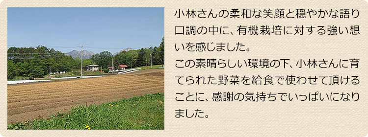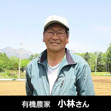 八ヶ岳の麓、標高約1150mの高地で、約5ヘクタールの畑で有機栽培を行う小林さん。タマネギ、大根、キャベツ、トウモロコシ、モロッコインゲン、花豆、金時豆、ゴボウ、長いも などを有機栽培されています。