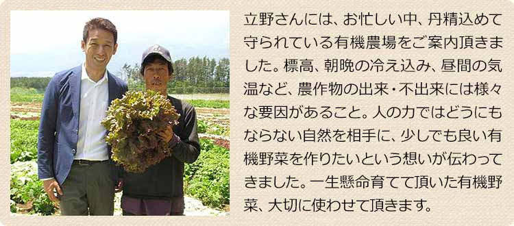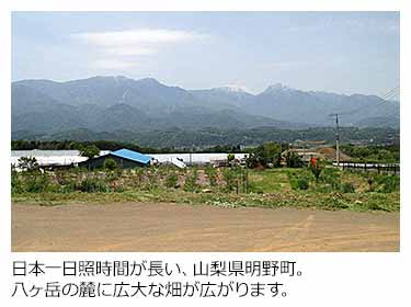 富士山・南アルプス・八ヶ岳が一望できる山梨県北杜市明野町。日本一日照時間の長いこの明野町 標高約850mの高地で、長芋、大根、白菜、キャベツ、レタス、リーフレタス、サニーレタス、とうもろこしなどの有機栽培をされています。