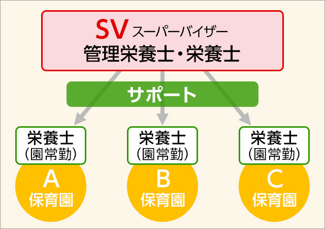 複数の保育園・幼稚園の給食室で活躍する管理栄養士・栄養士を支援する職務です。それぞれの園で活躍する管理栄養士・栄養士の皆さんに対して、献立や栄養管理・食育・事業所マネジメント上の悩みに対して相談にのり、アドバイスを行う職種です。