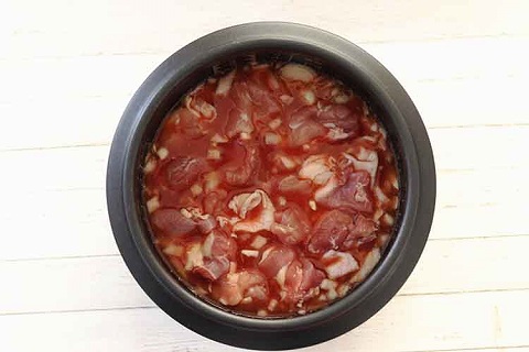 2. 次に鶏もも肉と玉ねぎを加え、白米の通常炊きで炊飯する。