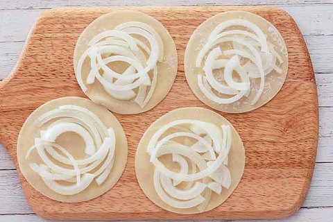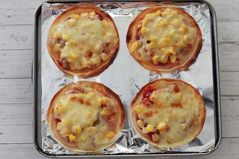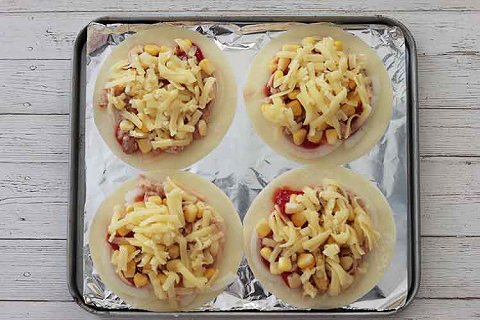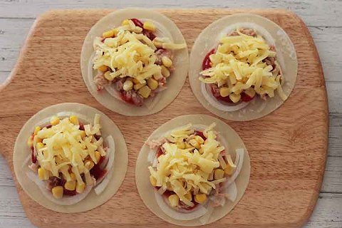 1. 餃子の皮に、薄切りにした玉ねぎ、トマトケチャップ、ツナ、コーン、ピザ用チーズを順にのせ、同じ手順で残りの餃子の皮も作る。