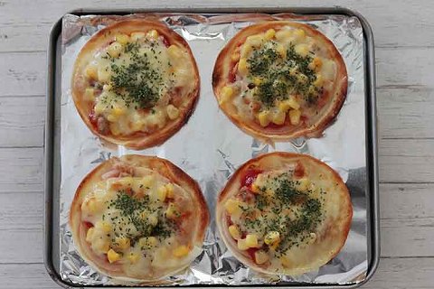 「おやつピザ」5分でできる餃子の皮を使ったピザ!幼稚園・保育園の人気の給食レシピ(富喜屋オリジナル食育レシピ)
