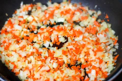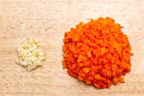 • 玉ねぎ、人参、にんにくは皮をむき、みじん切りにする。