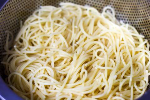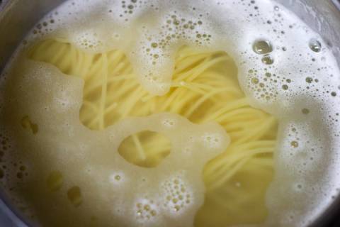 1. 大きめの鍋にたっぷりの水(分量外)を入れて沸騰させ、スパゲティを袋の表示時間通りに茹で、ザルにあげて水気を切る。