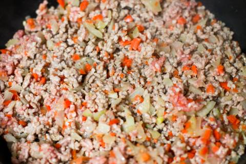 2. スパゲティが茹で上がる間に、フライパンにオリーブオイルを入れて中火で加熱し、玉ねぎ、人参、にんにく、合いびき肉を加えて全体がしっかりと火が通るまで炒める。