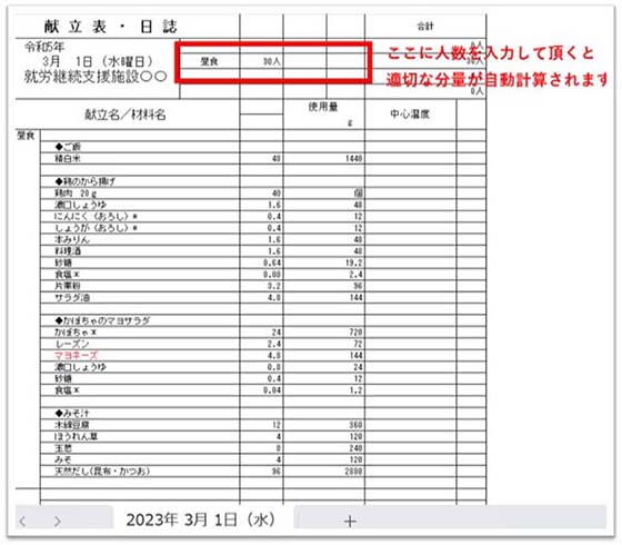 - 食事を提供する「人数」を入力するだけで、分量を自動計算するリストを毎日提供します。